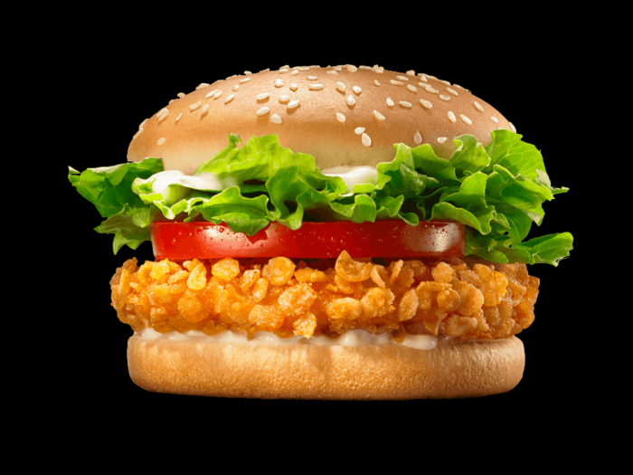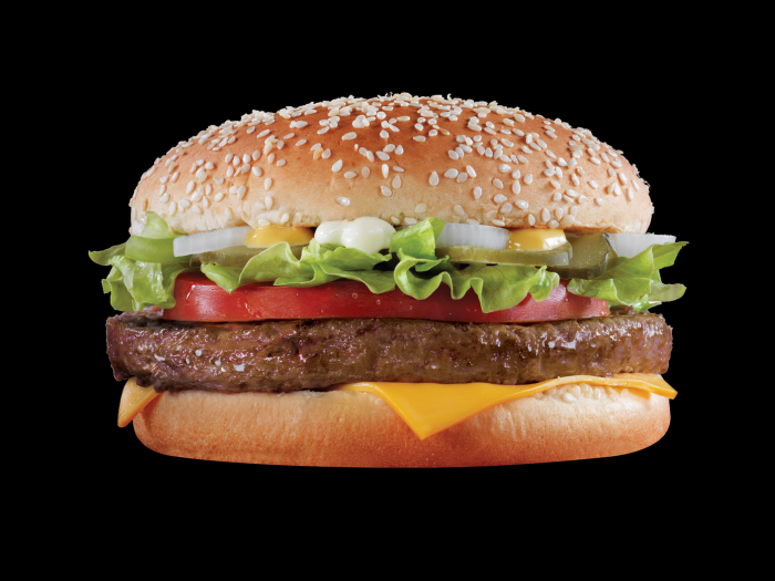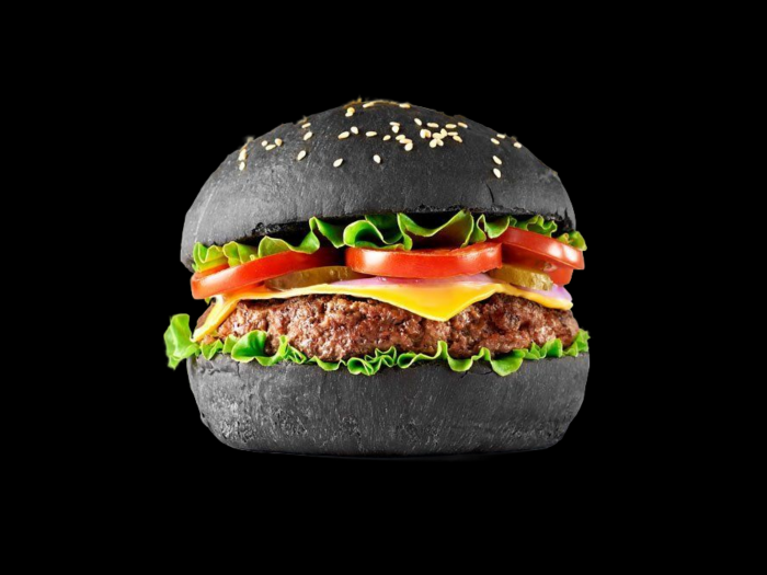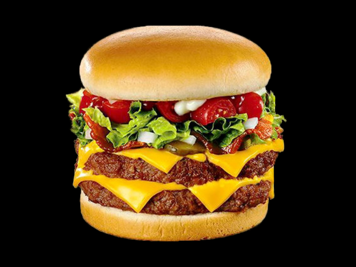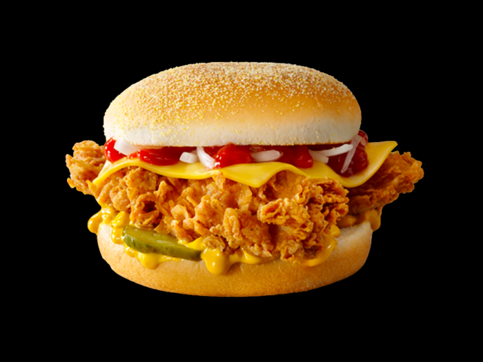 Состав: Бургерный соус, говяжья котлета, куриная котлета, сыр Чеддер, соус Чизгриль, салат, лук пай, огурец, томат.