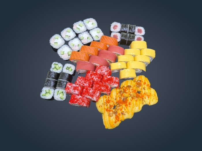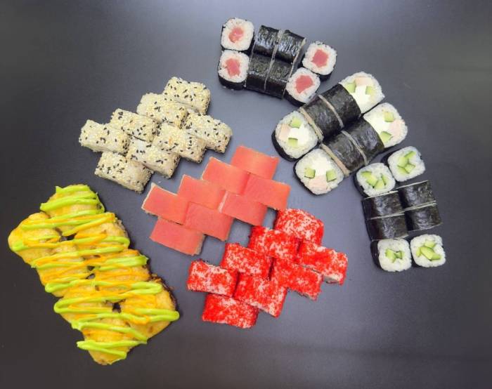 1815 гр. 56 шт. 1.Хосомаки Тунец 2.Хосомаки Огурец 3.Чизмак Курица 4.Восточный 5.Лотос 6.Якудза 7.Ажур